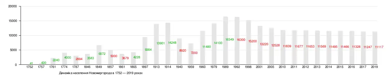 В 1897 році 9364 мешканців Новомиргорода розподілялись так: дворян — 201, купців — 20, міщан — 3977 та селян — 4913. Більшість населення становили росіяни, а частка українців серед жителів міста становила лише 6 %.[17]