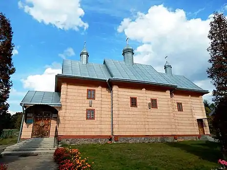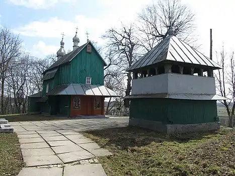 Дерев`яна церква стоїть на підвищенні, біля нового мурованого храму. Місцева чудо-перлина була збудована у 1713 році, мала 3 чотирикутні верхи, вкриті гонтом. Стіни зі смерекових стовбурів, оброблених рубанком, стояли на дубових підвалинах.