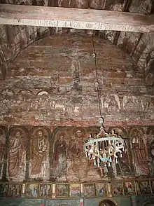 Унікальною пам'яткою мистецтва є настінний живопис. Він органічно поєднується з архітектонікою храму, що разом створює неповторний ансамбль. Характеризуються малювання різноманітністю стилю, народним трактуванням релігійного живопису. Виконувався живопис на замовлення окремих мешканців села. Центральну композицію «Деісусний чин» (моління)намальовано у 1673 році на замовлення Юри Іванишина художником Іваньковим. У 1673 році « Страшний суд» замовив Юра Петришин, ікону «Святий Миколай» у 1776 році замовили брати Ацьканичі, «Страсті»- Андрей (прізвище не збереглося). Настінні розписи мають значну художню цінність. Так, Богородиця — це втілення безмежної материнської любові на її обличчі і лагідність, і турбота, і горе, і покірність. Вона передбачає страждання, яке судилося пережити її Синові та їй. Марія тулить до себе Немовля міцно, мов боїться розлучитися із Ним, та все ж йде вперед, несучи Сина.
