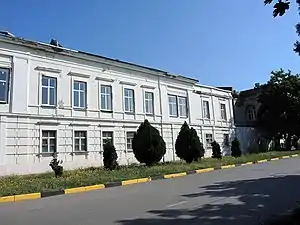 Будівля має два поверхи, збудована з цегли, під залізною покрівлею. Три ризаліти, які трохи виступають за основну лінію фасаду, мірний ритм віконних прорізів в прямокутних наличниках створюють його архітектурний вигляд. Перший поверх будівлі рустований, другий вінчають карниз з дентикулами і парапет з маленьким полуфронтоном. У середньому ризаліті знаходиться головний вхід. В гімназії існувала своя домова церква.[3]