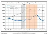 Динаміка населення з 1875 року в сучасних кордонах (Синя лінія: населення; Пунктир: відносна порівняльна динаміка населення землі Бранденбург; Сірий фон: період Третього рейху; Помаранчевий фон: період НДР)