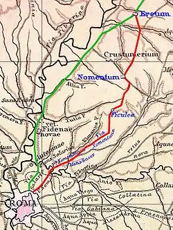 Номентанська дорога позначена червоним кольором а Соляна дорога зеленим