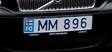 Транспортні засоби, зареєстровані після 1996 року, мають номерні знаки з білим фоном, синім текстом у власному стилі, дві літери і три цифри. Ліворуч — блакитна смуга з фарерським прапором і кодом "FO".