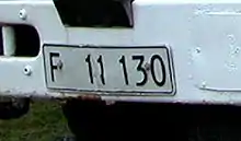 Транспортні засоби, зареєстровані на Фарерських островах до 1996 року, мають номерні знаки з білим тлом, чорний текст у данському стилі, але з однією літерою, F.