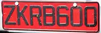 Складається з трьох літер і трьох цифр (наприклад, «ABC123») на темно-червону тлі. Початковий префікс «Z» був опущений після 2013 року.
