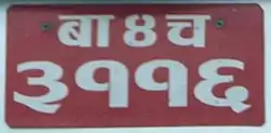 Номерні знаки Непалу побудовано у схожий з індійськийм принцип і виконано символами мови Деванагарі або Латинкою з видачею додаткового дублюючого номерного знаку. Формат розташування символів має вигляд A1B 2345, де A — код регіону реєстрації, 1 — серія (одна, дві цифри), В — код типу ТЗ, 2345 — номер (від однієї до чотирьох цифр).