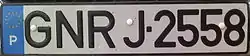 Номерні знаки білого кольору з чорним шрифтом, блакитною стрічкою з кодом (Р) та зірками Євросоюзу формату GNRA-1234. GNR — Гвардія Національна Республіканська, А — код підрозділу, 1234 — номер.