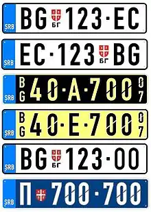 Випуск нових номерних знаків для автомобілів, які знаходяться в Сербії, почався 1 січня 2011 року. Нові знаки білого кольору, обрамлені чорною лінією, На лівій стороні, на синьому тлі, знаходяться білі букви з міжнародним позначенням Республіки Сербія-SRB. Чорні букви і цифри знаходяться на білому фоні.