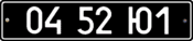 - 4 — Номерні знаки для автотранспорту дипломатичних представництв, консульств, представництв міжнародних організацій і членів родин їхнього персоналу. Розмір — 520×112 мм, тло — біле, символи — чорні.