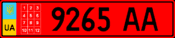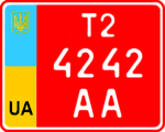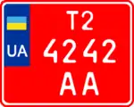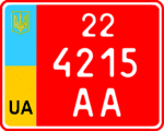 - 6.2 — Номерні знаки, видані торговельним підприємством, для тимчасового використання на мотоциклах, мотоколясках і моторолерах. Розмір — 220×174 мм, тло — червоне, символи — білі.