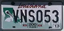 Номерні знаки Луїзіани видаються Офісом моторних транспортних засобів (OMV). Штат Луїзіана вимагає розміщення тільки заднього номерного знаку на автомобілі. Регулярні номерні знаки Луїзіани мають формат АБВ123. Кодування відсутнє. В 2013 році, після закінчення ювілейного року набуття статусу штату Луїзіаною, повторно розпочато видачу регулярних номерних знаків на бланку зразка 2005 року. Ці бланки мають градієнтне біло-жовто-рожеве тло з переходом згори вниз. В центрі пластини розташоване традиційне зображення пелікану. В нижньому рядку відтворено традиційне з 1958 року гасло: спортсменський рай (SPORTSMAN'S PARADISE).