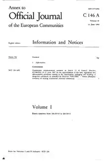 | Європейський перелік існуючих комерційних хімічних речовини (einecs) | Речовин, крім полімерів, які були записані у продажу в ЄС з 1 січня 1971 року по 18 вересня 1981 року.[3] були зареєстровані у відповідності зі статтею 8(1) з небезпечними речовинами (67/548/ЕЕС). Вони вважаються фази речовин у рамках Регламенту Reach. | 2хх-ХХХ-х 3 * Х-ХХХ-х |