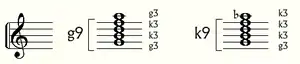 Твір Карлхайнца Штокхаузена Stimmung (1968) для вокального секстету[8] починається з акорду, що складається з нот B ♭, F, B ♭, D, A ♭ і C. [9] За словами Ніколаса Кука, [10] З точки зору загальноприйнятої тональної гармонії, Stimmung можна розглядати як «домінантовий нонакорд, який піддається тембральним варіаціям. Ноти, які співають виконавці, є гармоніками №№ 2, 3, 4, 5, 7 і 9 відсутнього основного тону сі-бемоль».