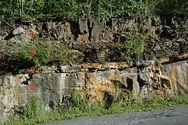 Кембрійські вапняки (B) на прекембрійських гнейсах (D) з пермським сіллом із лапрофіру (A)