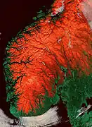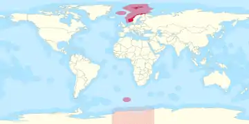 файл), офіційна назва — Королі́вство Норве́гія (норв. Kongeriket Norge) — північноєвропейська держава на Скандинавському півострові, загальною площею 385,207 тис. км² (69-те місце у світі)[5]. Окрім материкової частини, Норвегії належить арктичний архіпелаг Шпіцберген та острів Ян-Маєн на межі Гренландського й Норвезького морів, острів Буве у Південній Атлантиці[6].