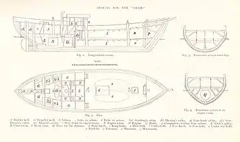 На «Фрамі» було вісім шлюпок, в тому числі два баркаси довжиною 8,8 м, що мали палуби й оснащені вітрилами. Вони призначалися для продовження дрейфу в разі руйнування судна, оскільки могли вмістити весь екіпаж, великі запаси провіанту й палива. Були чотири китобійні вельботи довжиною 6,3 м, два з дубової деревини, два — з в'язів, а також прам і моторний катер[28]. Останній лише заважав і пізніше був розібраний, а його в'язові дошки пішли на виготовлення лиж і нартів. Баркаси розташовувалися на головному трюмному люці, вельботи висіли на шлюпбалках, моторний катер і прам були закріплені на палубі[29].