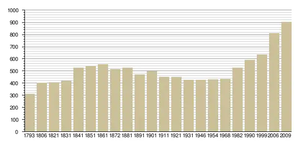 Динаміка населення (base Cassini de l'EHESS pour les nombres retenus jusque 1962[3], base Insee à partir de 1968 (population sans doubles comptes puis population municipale à partir de 2006)[4] · [5] ):