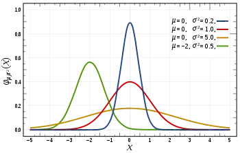 Густина імовірності стандартного Гауссового розподілу (стандартного нормального розподілу) (із нульовим середнім і одиничною дисперсією) часто позначається грецькою літерою (Фі).[3] Також часто використовується інша форма літери фі — .