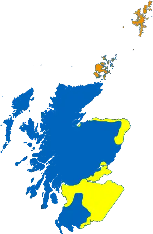 ![]() Мови Шотландії на початку XV століття, згідно топоніміки. Помаранчевим позначено норн, жовтим — шотландська-англійська і синім шотландська-гельська | |