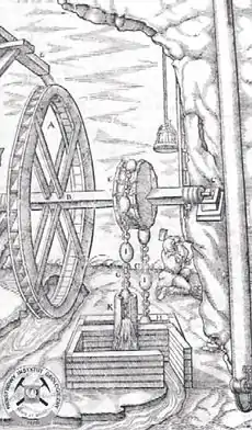 Наводимо уривок з праці Георга Агріколи De Re Metallica (1556 р.), який саме присвячений опису одного з типів норії часів пізнього Середньовіччя (див. рис.):