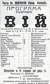 Збереглася афіша, яка сповіщала: в суботу, 14 квітня 1923 у театрі робітничого клубу ім. Пролетарської революції відбудеться бенефіс українського артиста і співака Василя Носачевського у фантастичній феєрії «Вій» за Гоголем (режисер Вовк). В анонсі сповіщалося про підготовку до постановки відомих п’єс «Серед бурі», «Про що тирса шелестіла».