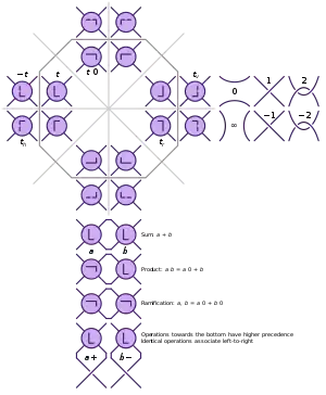 Якщо сплетення a дзеркально відобразити відносно прямої північний захід/південний схід, отримане нове сплетення позначають як −a (зауважимо, що це відрізняється від сплетення з оберненими перетинами). Сплетення мають три бінарні операції: сума, добуток і галуження (англ. ramification)[2], однак всі їх можна виразити операціями додавання і віднімання. Добуток сплетень a b еквівалентний −a+b, а галуження a, b еквівалентне −a+−b.