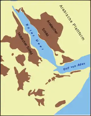 Нубійсько-Аравійський щит – виступ докембрійського фундаменту NE Африканської платформи. Осьова частина Нубійсько-Аравійського щита розсічена з північного заходу на південний схід рифтом Червоного моря на дві частини – Нубійську (на заході) і Аравійську (на сході). Щит складений в основному породами низів верхнього протерозою – гнейсами, кристалічними і метаморфічними сланцями, кварцитами, мармурами. Крім того, мають місце інтрузії гранітів, молоді виливи базальтів.[1]