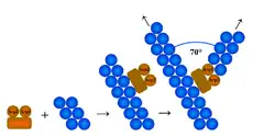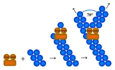 - Галуження з (+)кінця (англ. barbed end branching): комплекс ARP 2/3 приєднується до плюс кінця материнського філаменту і каталізує утворення двох гілок, розміщених під кутом 70° одна до одної.