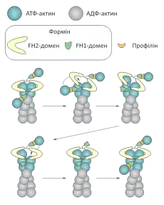 Форміни присутні майже у всіх досліджених еукаріотичних клітинах. Їхньою характерною ознакою є наявність двох доменів гомології формінів (англ. Formin Homology domain) — FH1 та FH2. Безпосередню участь у нуклеації бере домен FH2, і його достатьно для цього процесу. Форміни активні як гомодимери, у складі яких їхні FH2 домени утворюють кільце, що охоплює дві молекули актину. Така конформація білка називається «закритою» і вона перешкоджає додаванню нових субодиниць до мікрофіламенту. Проте формін може переходити у «відкриту» конформацію, яка сприяє полімеризації на (+)кінці: існують дві гіпотези, що описують цей процес. Згідно із першою формін спочатку просувається на один «крок» вздовж мікрофіламенту звільняючи місце для приєднання нової молекули актину, згідно із другою, навпаки — спочатку приєднується новий актиновий мономер, після чого формін посувається на один «крок».[6]