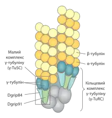 Складовою частиною γ-TuRC є малі комплекси γ-тубуліну (англ. γ-Tubulin Small Complex, γ-TuSC), що побудовані із двох молекул самого γ-тубуліну та ще двох білків: Dgrip84 та Dgrip91 (англ. Drosophila gamma ring protein) у дрозофіли, Spc97 та Spc98 у дріжджів, Xgrip109 та Xgrip110 у Xenopus laevis[3] та GCP2 і GCP3 у людини.[4] Вони мають V-подібну форму та розміщуються по спіралі у складі γ-TuRC. Кожна молекула γ-тубуліну в такому колі взаємодіє із α-тубуліном у димерній субодиниці мікротрубочок. Проте, оскільки γ-TuSC мітить 2 молекули γ-тубуліну, їх кількість мусить бути парною, а отже не може бути рівною кількості протофіламентів у мікротрубочці. Швидше за все, γ-TuRC містить шість комплексів γ-TuSC (а отже 12 γ-тублінів), в одному місці між ними існує проміжок. Крім γ-TuSC до складу кільцевого комплексу також входять інші допоміжні білки, що утворюють кеп («шапочку») на його кінці. Кеп може брати участь у прикріпленні всієї структури до центросоми або виконувати інші функції.[3]