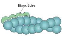 Білок Spire містить чотири домени WH2, кожен з яких може взаємодіяти із мономерним актином. Таким чином він може забезпечувати нуклеацію, утворюючи і стабілізуючи ядро із чотирьох мономерів. Проте деталі цього механізму залишаються нез'ясованими: деякі дослідження вказують на те, що Spire асоціює із (-)кінцем, тоді як інші свідчать про взаємодію із (+)кінцем; також незрозуміле взаємне розміщення актинових мономерів у тетрамерному ядрі під час нуклеації.[6]