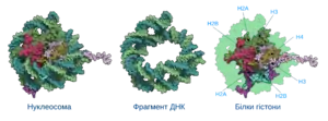 Нуклеосома — структурна частина хроматину, утворена ділянкою нитки ДНК намотаною на серцевину із основних білків-гістонів, має діаметр ~11 нм[1]. Нуклеосоми є першим рівнем упакування ДНК еукаріот (необхідне для поміщення ДНК загальною довжиною близько метра у ядро діаметром 5—10 мкм), а також архей, і забезпечує її компактизацію приблизно у сім разів і захищає її від ушкоджень[2]. Серцевина нуклеосоми складається із восьми білків: по дві копії гістонів H2A, H2B, H3 і H4, N-кінець (хвіст гістону) кожної білкової молекули виступає назовні нуклеосоми і може бути місцем різних ковалентних модифікацій. Довжина ділянки ДНК, що входить до складу нуклеосоми, становить 146 п.н., вона намотана на білкову серцевину у вигляді лівозакрученої суперспіралі 1,7 рази. Нуклеосоми розміщуються вздовж ДНК досить регулярно, на найчастіше відстані від 8 до 80 (довжина лінкерної ДНК, зв'язаної із гістоном H1)[3]. Таким чином нуклеосоми повторюються приблизно кожних 200 п.н., одна диплоїдна клітина людини містить приблизно 30 млн нуклеосом[1]. Послідовність нуклеосом і лінкерних ділянок формує 10 нм філамент, що має вигляд «намистин на нитці» і переважно підлягає подальшій компактизації.