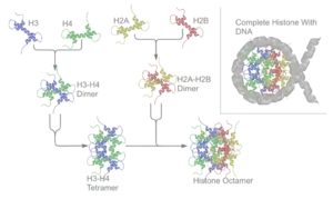 Нуклеосоми формуються відразу після реплікації ДНК, або інших процесів, що вимагають їх тимчасового усунення. Білкова серцевина нуклеосоми збирається у кілька етапів: спершу формуються димери H2A-H2B і H3-H4, після цього два димери H3-H4 об'єднуються у тетрамер, до якого згодом приєднуються два димери H2A-H2B[1]. Утворені білкові серцевини після реплікації включаються до хроматину за участі білкового комплексу RCAF (англ. replication-coupling assembly factor), що містить ацетильовані гістони H3 і H4, тримерний білок CHAF1A (англ. chromatin assembly factor 1) і білок ASF1A (англ. anti-silencing factor 1). Хоч механізм дії RCAF повністю не з'ясований, вважається, що він безпосередньо взаємодіє із апаратом реплікації. Якщо нуклеосоми повинні бути утворені після репарації або інших процесів, це забезпечується іншими білковими комплексами. Існують також фактори обміну гістонів, що можуть заміщувати гістони у нуклеосомі на варіантні форми[3].