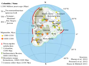 - Rogers, JJW and Santosh, M., 2002,Configuration of Columbia, a Mesoproterozoic supercontinent.Gondwana Research, v. 5, pp. 5-22