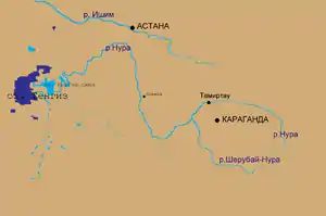 - Канал Іртиш — Караганда перетинає річку Нуру на ділянці русла між селищами Ботакара та Габідена Мустафіна, по дюкеру.