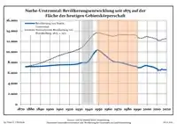 Динаміка населення з 1875 року в сучасних кордонах (Синя лінія: населення; Пунктир: відносна порівняльна динаміка населення землі Бранденбург; Сірий фон: період Третього рейху; Помаранчевий фон: період НДР)