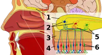 Система органів нюху людини. 1: Нюхова цибулина 2: Мітральні клітини 3: Кістка 4: Назальний епітелій 5: Нюховий клубочок 6: Нюхові рецептори