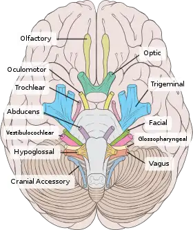 | Вигляд людського мозку знизу з поміченими черепними нервами. | |