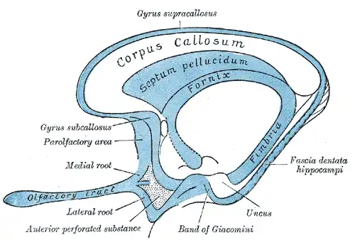 Нюховий тракт (лат. tractus olfactorius) являє собою в'язку аксонів, що з'єднують мітральні і ворсові клітини нюхової цибулини із декількома цільовими сегментами мозку; серед яких - енторінальна кора, грушеподібна кора і мигдалеподібне тіло. Являє собою вузьку білу смужку, трикутну в корональному відділі, з вершиною спрямованою вгору. Нюховий тракт пролягає у нюховій борозні на нижній поверхні лобної долі мозку і розділяється на медіальну нюхову смужку і латеральну нюхову смужку.