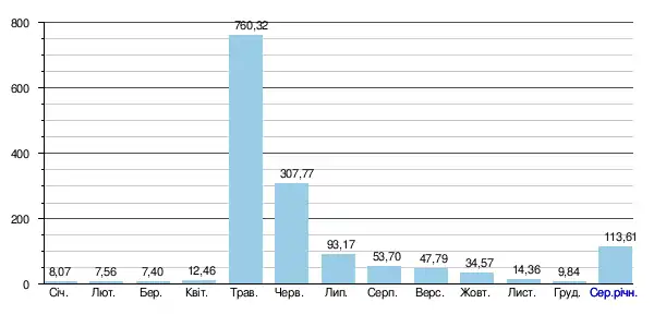 За період спостереження, абсолютний мінімальний місячний стік (абсолютний мінімум) становив 2,84 м³/с (у лютому 1969 року), абсолютний максимальний місячний стік (абсолютний максимум) становив 1450 м³/с (у травні 1992 року).