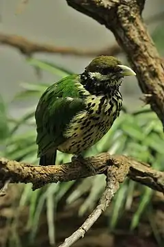 Птах завдовжки 24 см, вагою 100—172 г. Це птахи з масивною і пухкою зовнішністю, з маленькою та округлою головою, міцним конічним дзьобом, злегка зігнутим донизу, витягнутими і міцними ногами, довгими крилами і досить довгим, тонким і прямокутним хвостом. Спина, крила, хвіст зеленого кольору. Кінчики хвоста сині. Верх голови коричневий. Від основи дзьоба до вух нижче очей проходить біла широка смуга. Груди та черево бежеві з чорними крапками.