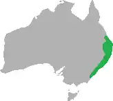 Ендемік Австралії. Поширений вздовж східного узбережжя країни на сході Нового Південного Уельсу та на південному сході Квінсленду. Мешкає в тропічних та субтропічних низовинних лісах та евкаліптових лісах.