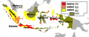 Столицею Голландської Ост-Індії була Батавія, зараз Джакарта — столиця Індонезії. Хоча острів Ява контролювався Голландською Ост-Індською компанією та голландської колоніальною адміністрацією протягом 350 років, з часів Яна Куна, повний контроль над більшою частиною Голландської Ост-Індії, включаючи острови Борнео, Ломбок та західну частину Нової Гвінеї, був встановлений лише на початку XX століття[3].
