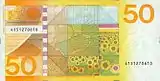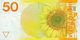 50 гульденів | 148 х 76 | Жовтий | Зображення соняшника та бджоли що сидить на ньому | Поле соняшників, зображення карти | 1982 | |||