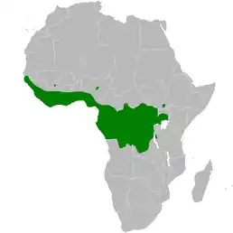 Вид поширений у Західній та Центральній Африці від Сенегалу до Уганди. Трапляється у лісистих місцевостях.[3]