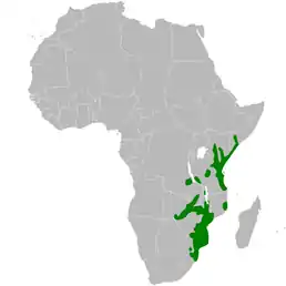 Вид поширений у Східній Африці. Трапляється в Кенії, Малаві, Мозамбіку, Сомалі, ПАР, Свазіленді, Танзанії, Замбії та Зімбабве. Мешкає субтропічні або тропічні сухих лісах, саванах, рідколіссях.