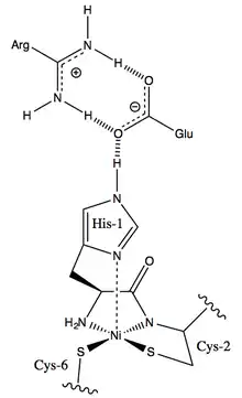 В окисленого ферменту координаційна геометрія нікелю (III) характеризується пірамідальним розташуванням донорних атомів[2][3][7]. Проте, чи є атом нітрогену з гістидину 1 аксіальним лігандом досі невідомо[3][4][7]. Якщо гістидин не є лігандом у відновленому ферменті, то кофактор нікель (II) матиме планарне розташування донорних атомів[2][5][7]. Однак, His-1 може залишатися на місці протягом усього окисно-відновного циклу, а це означає, що нікелевий кофактор завжди буде мати пірамідальне з квадратом в основі розташування донорних атомів. His-1 утримується на місці над нікелевим кофактором в щільній мережі водневих зв'язків із залишками глутамату та аргініну[2].