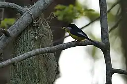 Довжина птаха становить 15 см. Верхня частина тіла чорна, нижня частина тіла яскрво-жовта, крила білі. Горло біле, відокремлене від жовтих грудей чорним «комірцем». Хвіст довгий, чорний. Самичка має менш яскраве забарвлення, чорний «комірець» у неї відсутній.