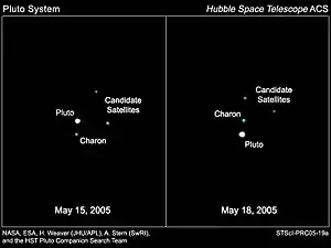 Фото, на основі якого були відкриті другий (Нікта) і третій (Гідра) супутники Плутона, отримане між 15 і 19 травня 2005 р. за допомогою телескопа «Габбл» членами групи англ. Hubble Space Telescope Pluto Companion Search Team. Супутники на них були вперше виявлені 15 липня 2005 р. — зробили це Макс Дж. Мучер (англ. Max J. Mutchler) і Андру Дж. Стефель (англ. Andrew J. Steffle), а 15 серпня 2005 їх назвали S/2005 P 2 (Нікта) і S/2005 P 3 (Гідра). Після додаткових досліджень і перевірок, 31 жовтня 2005 р. у міжнародному астрономічному циркулярі (англ. International Astronomical Union Circular (IAUC)) № 8723 було офіційно повідомлено про відкриття. Його текст у форматі pdf можна переглянути на сайті Гарвардського Університету. У 2006 р. супутники одержали сучасні назви.