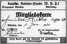 - На момент вступления Гитлера в ряды DAP, последняя не имела формальных удостоверений о членстве. Первый список членов партии был составлен только в январе 1920. Список был составлен по алфавиту, и Гитлер занимал в нём место № 555. На самом деле его номер был 55-м, но для создания иллюзии численности список был начат с № 501. В своей автобиографической книге «Моя борьба» Гитлер утверждал, что его номер был 7-м, что указывало бы на его принадлежность к руководству партии. Позднее членская карточка Гитлера была подделана в соответствии с этим утверждением.